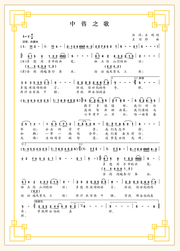 《中咨之歌》旋律優(yōu)美、抒情大氣,易上口傳唱,歌詞凝煉了公司服務(wù)國家、貢獻社會的歷史傳承,凸顯了新時期高端智庫建設(shè)的宗旨目標(biāo),展現(xiàn)了中咨人志存高遠、矢志不渝、開拓創(chuàng)新、追夢筑夢的精神風(fēng)貌。曾獲得中國職工音樂家協(xié)會和國資委新聞中心聯(lián)合舉辦的2016中國職工好歌曲創(chuàng)作征集評選活動“優(yōu)秀創(chuàng)作歌曲”表彰,并在權(quán)威雜志《歌曲》刊發(fā),中國曲譜網(wǎng)選登發(fā)表。